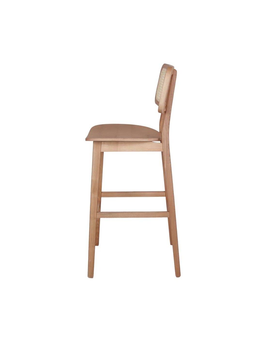 Taburete alto estilo Bistró - Vintage, elaborado en madera maciza de fresno, con respaldo estilo canage en fibra de ratán natural. Un diseño minimalista y sofisticado que se adapta fácilmente a cualquier estilo decorativo, ya sea en el hogar o en locales de hostelería y restauración. La madera utilizada en su fabricación le aporta solidez y resistencia. Además, el respaldo trenzado ofrece un extra de confort y ergonomía para la espalda.