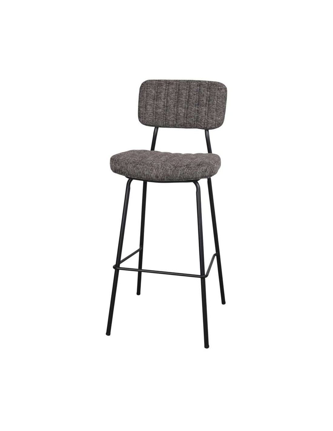 Taburete alto estilo Industrial - Contemporáneo, con estructura en acero pintado negro por pulverización y asiento y respaldo tapizados en textil color marrón. Un taburete confortable y ligero, perfecto para cualquier estancia del hogar.