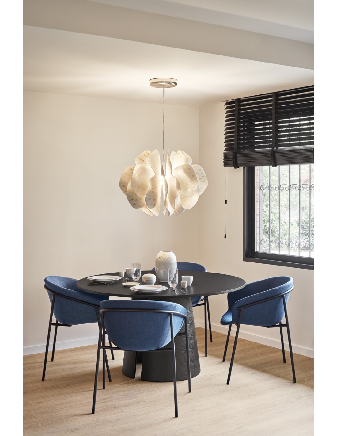 La silla Hug destaca por su estructura metálica que envuelve delicadamente el cuerpo tapizado, creando una sensación de abrazo. Su amplio y cómodo monocasco invita a disfrutar de largas sobremesas y cenas en buena compañía. Es la primera creación de Cambres Design para Teulat, marcando el inicio de una colaboración con mucho carácter.