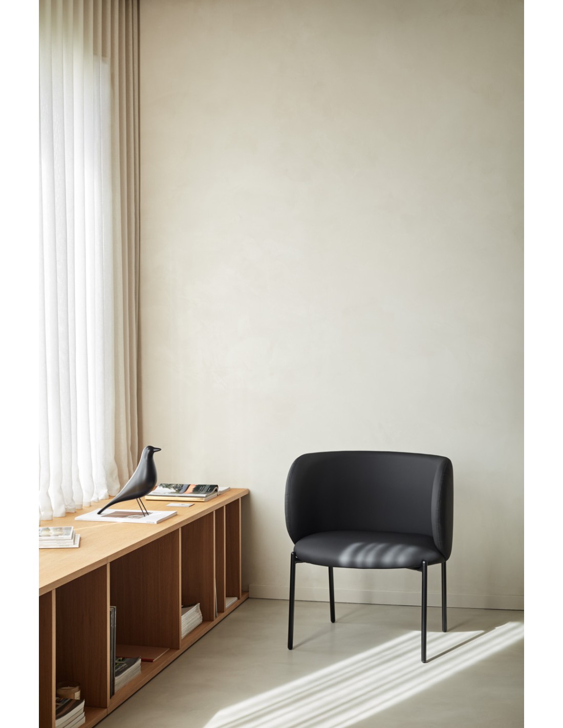 El nombre Mogi, que en coreano significa “mosquito”, da identidad a una butaca elegante y de líneas atemporales. Su silueta envolvente invita a relajarse, ofreciendo una sensación de calma y confort. El respaldo, fabricado en contrachapado curvado y tapizado, se combina con unas patas de metal que aportan estabilidad y un toque contemporáneo.
