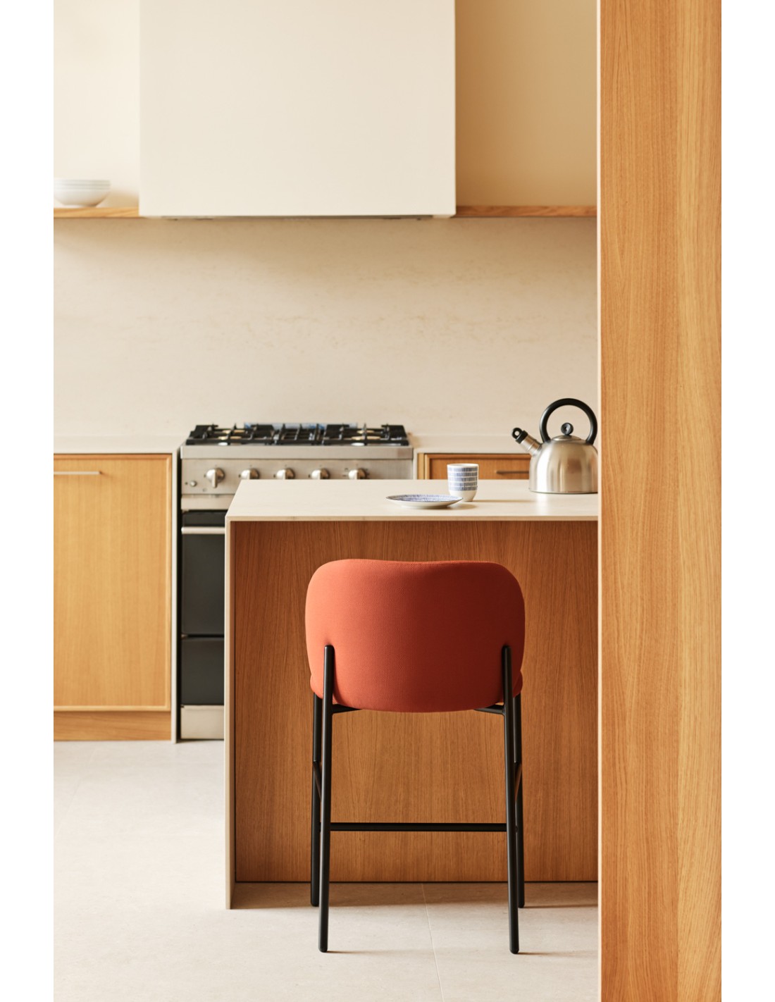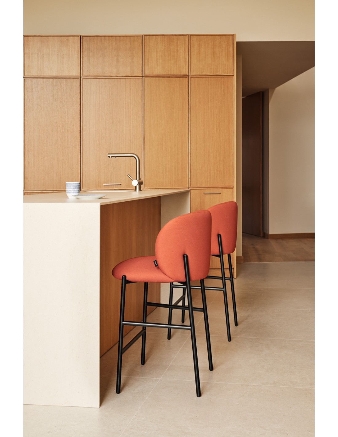 El nombre Mogi, que en coreano significa “mosquito”, da identidad a un taburete elegante y de líneas atemporales. Su silueta envolvente invita a relajarse, ofreciendo una sensación de calma y confort. El respaldo, fabricado en contrachapado curvado y tapizado, se combina con unas patas de metal que aportan estabilidad y un toque contemporáneo.