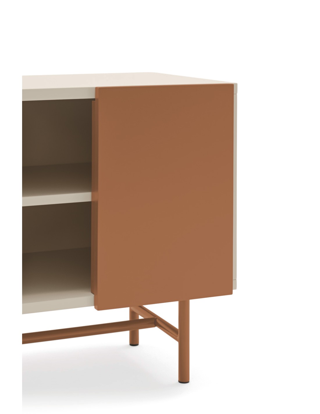 La colección Nube se caracteriza por su diseño original, marcado por una puerta corrediza que puede ubicarse a gusto de cada persona. Este mueble está fabricado en MDF lacado, con una puerta del mismo acabado que se desliza suavemente sobre la superficie. La estructura descansa sobre patas metálicas también lacadas, aportando estabilidad y un toque contemporáneo.