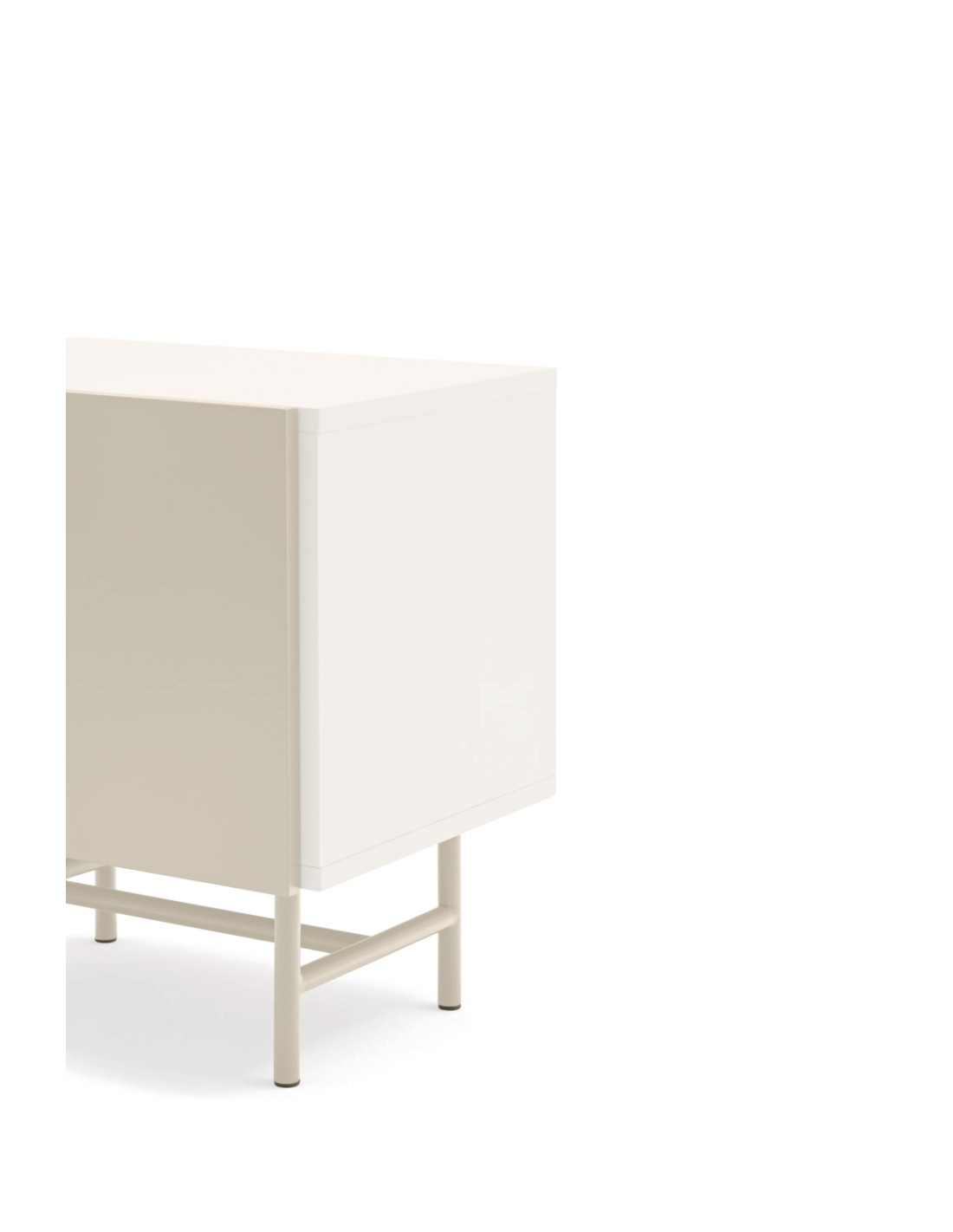 La colección Nube se caracteriza por su diseño original, marcado por una puerta corrediza que puede ubicarse a gusto de cada persona. Este mueble está fabricado en MDF lacado, con una puerta del mismo acabado que se desliza suavemente sobre la superficie. La estructura descansa sobre patas metálicas también lacadas, aportando estabilidad y un toque contemporáneo.