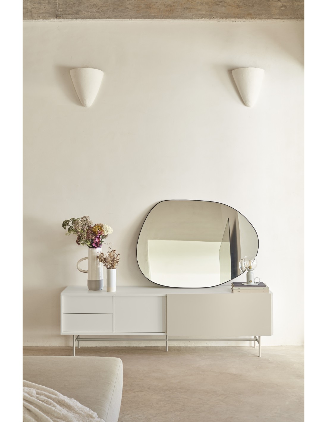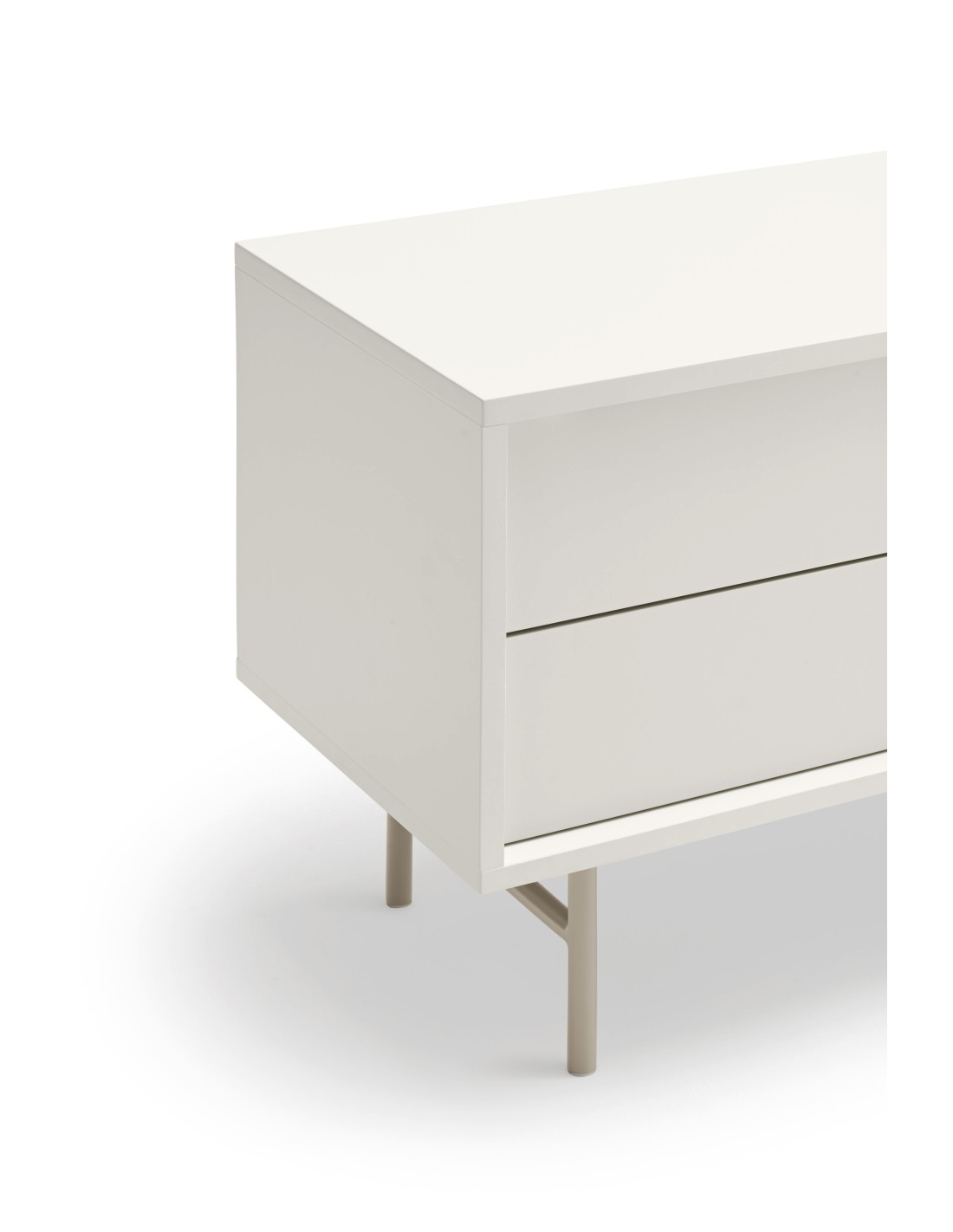 La colección Nube se caracteriza por su diseño original, marcado por una puerta corrediza que puede ubicarse a gusto de cada persona. Este mueble está fabricado en MDF lacado, con una puerta del mismo acabado que se desliza suavemente sobre la superficie. La estructura descansa sobre patas metálicas también lacadas, aportando estabilidad y un toque contemporáneo.