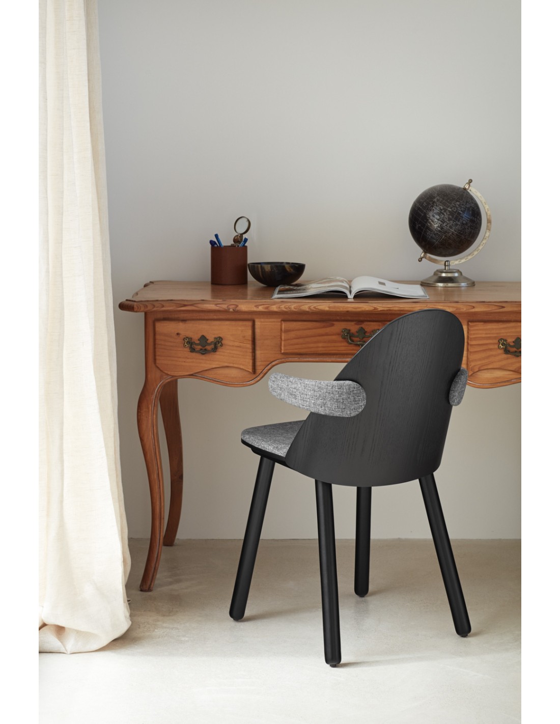 La silla Uma seduce a través de su diseño, fruto de una delicada combinación de líneas curvas y rectas que transmiten sencillez y ligereza visual sin comprometer la comodidad. Fabricada íntegramente en madera, recupera el saber hacer de la ebanistería tradicional. Sus brazos y cojín, tapizados en tela, aportan un extra de confort y un acabado elegante.