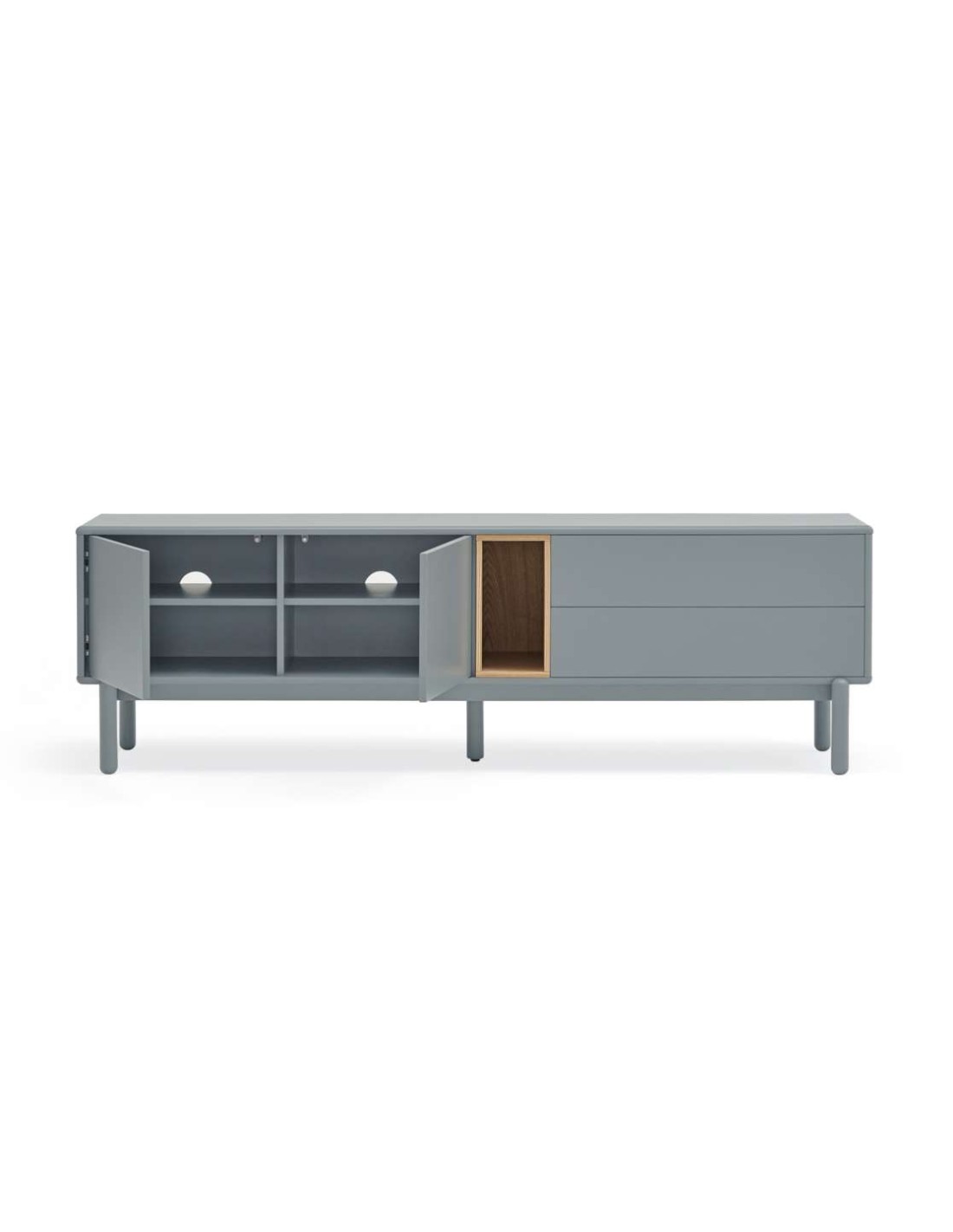 Mueble de TV elaborado en DM lacado gris perla con patas de madera a tono. Cuenta con dos cajones, un compartimiento con dos puertas y un nicho abierto chapado en roble acabado natural. Diseño contemporáneo exclusivo de la marca Teulat.